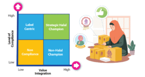 Dari dua dimensi tersebut, terbentuklah empat kuadran yang mencerminkan empat profil perusahaan dalam menerapkan halal. Pertama idaman kita semua adalah kuadran yang disebut Strategic Halal Champion. Perusahaan yang telah matang dalam menjalankan praktik halal, dan memiliki nilai tinggi di mata konsumen. Produk yang dihasilkan bukan saja halalan-toyyiban, namun juga memiliki daya saing yang tinggi dan sulit ditiru oleh pesaing. Salah satu manifestasi prinsip beyond halal adalah perfection, yaitu memberikan layanan dan produk terbaik kepada pelanggan. Kuadran berikutnya adalah Label Centric, di mana perusahaan hanya berfokus pada memenuhi standar halal yang ditetapkan oleh regulator. Perusahaan seperti ini sering kali hanya melayani segmen muslim “hijau” yang fanatik namun jumlahnya sedikit, dan sulit untuk bisa menembus pasar yang lebih luas. Kuadran lain adalah Non-Halal Champion, yaitu perusahaan yang memiliki produk bagus, namun belum masuk ke prinsip halal secara mendalam. Dan kuadran terakhir adalah Non-Compliance di mana perusahaan abai akan label dan prinsip halal.