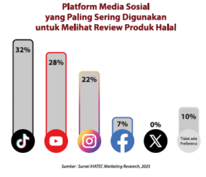 Ketika berbicara mengenai platform yang digunakan, data survei memberikan gambaran yang sangat jelas mengenai hierarki dominasi media sosial dalam konteks produk halal. Dari sisi platform, TikTok menempati posisi teratas sebagai media sosial yang paling sering digunakan konsumen untuk melihat review produk halal, dengan persentase sebesar 32%.