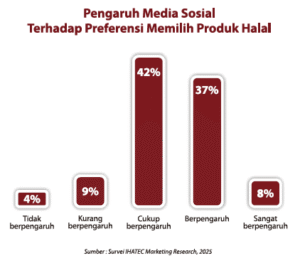 Sebanyak 42% responden menyatakan bahwa media sosial cukup berpengaruh dalam preferensi mereka memilih produk halal. Bahkan, persentase yang lebih besar, yakni 45% responden, menilai media sosial berpengaruh hingga sangat berpengaruh terhadap pilihan mereka. Secara kolektif, angka-angka ini menunjukkan bahwa media sosial telah menjadi faktor penting yang secara signifikan dapat memengaruhi cara konsumen menentukan pilihan produk mereka.