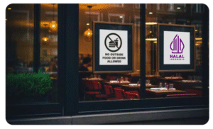 Khusus produk dari restoran yang menyajikan produk dengan konsep dine in, wajib membuat aturan larangan pengunjung untuk tidak membawa produk dari luar. Larangan masih bisa dilonggarkan dengan hanya mengizinkan produk luar yang berlabel halal. Agar pengunjung dapat mengetahuinya, pernyataan larangan perlu diletakkan di dekat pintu masuk. Jika diperlukan karyawan dapat menyambut pengunjung di pintu masuk sehingga mudah jika menyampaikan langsung saat mendapati pengunjung membawa produk makanan dari luar.